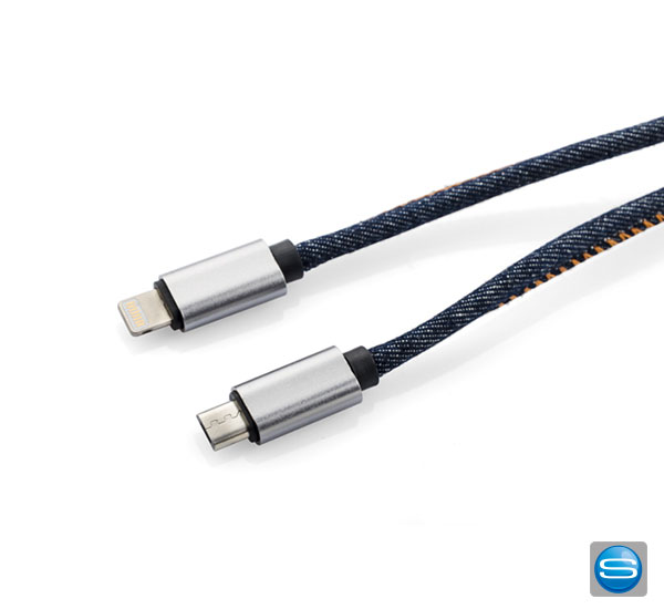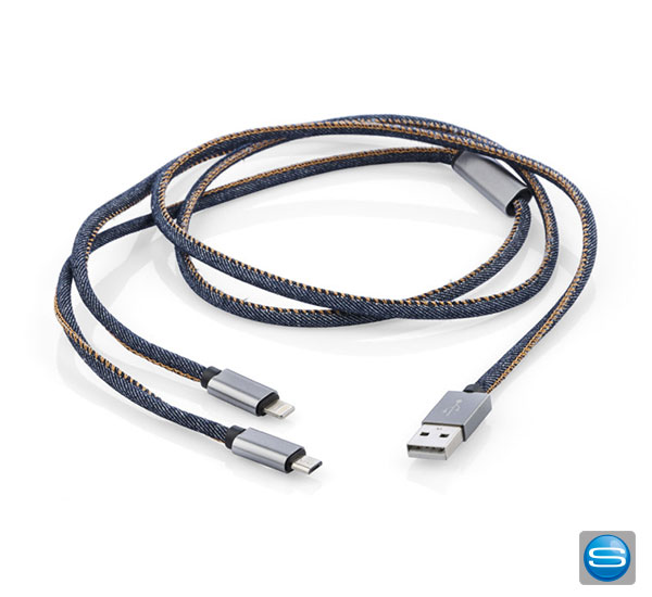 EIn praktisches 2in1 Kabel aus Jeans hergestellt. Das auf dem Verbindungsstück gravierbare Kabel verfügt über 2 Anschlüsse: Micro-USB Kabel zum Laden von Android Geräten und zur Datenübertragung sowie einen Anschluss für das IPhone 5 und höher zum Laden. Ein trendiges Werbegeschenk welches mit Ihrem Logo oder Motiv individualisiert werden kann!