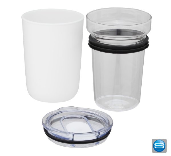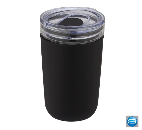 420ml Borosilikatglas Becher mit Gehäuse aus recyceltem Kunststoff als Werbeartikel