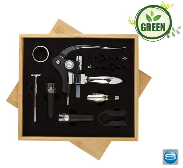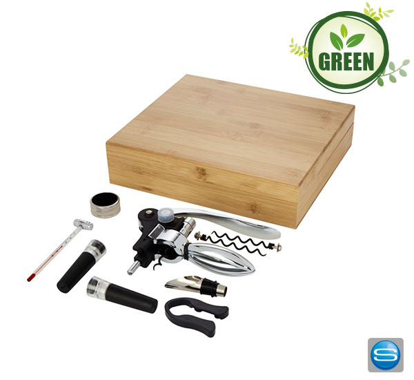 Das 9-teilige Weinset besteht aus einem Korkenzieher, zwei Stopfen, einem Ausgießer, einem Ring, einem Banderolenschneider, einem Thermometer und zwei Ersatzkorkenzieher. Ihr Logo kann auf der Box angebracht werden. Die Box ist aus Bambus und wird nach den nachhaltigen Standards bezogen und produziert. Das Weinset kann hervorragend als exklusives Give-Away auf einer Messer oder für ausgewählte Kunden genutzt werden.