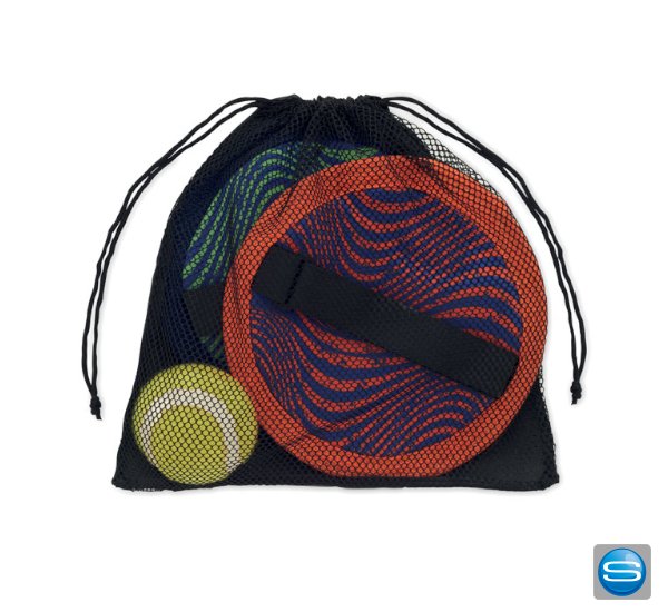 Das Ballfangspiel aus robustem Neopren sorgt für Spiel und Bewegung drinnen wie draußen. Enthalten sind zwei Fangteller und ein Ball – ideal für Kinder, Familien oder Teamevents.Ballfangspiel als Werbegeschenk