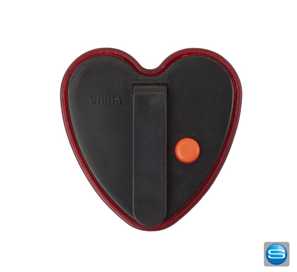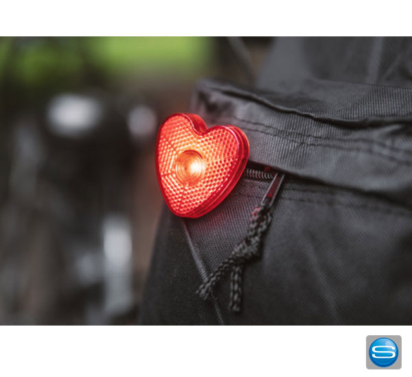 Die veredelbare Blinkleuchte ist aus Kunststoff in Form eines Herzens, mit Befestigungsclip für die Anbringung an Fahrradspeichen. Ihr Firmenzeichen wird mittels Tampondruck oder Digitaldruck auf dem Werbeträger angebracht.