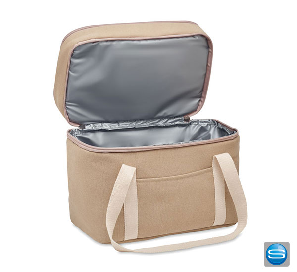 Die individuell bedruckbare Kühltasche mit 2 Fächern ist aus gewaschenem Canvas mit Baumwoll-Gurt. 320 g/m². Isolierung: 15C PEVA mit 6mm PE-Schaum. Ihr Firmenzeichen wird mittels Siebdruck, Transfer Siebdruck oder Digitalertransferdruck angebracht.