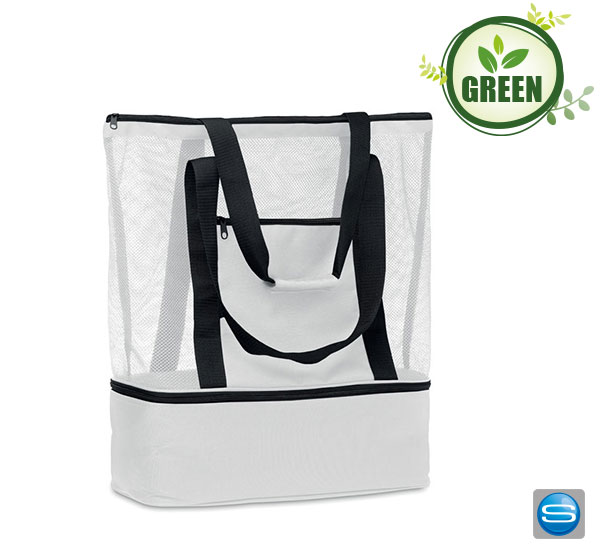 Ob für den Einkauf oder einen Tag am See oder Strand - diese Tasche ist immer praktisch! Die bedruckbare Tragetasche aus 600D RPET ist im oberen Teil luftdruchlässig durch das transparentem RPET-Netz. Ihre Getränke oder das Eis bleiben im unteren Teil, welcher als Kühlfach dient, immer frisch! Zusätzlich können Sie Accessoires in einer kleinen Reißverschlusstasche verstauen. Ihr Logo oder Motiv findet auf der Vorderseite der Tragetasche mit den langen Tragegriffen Platz!