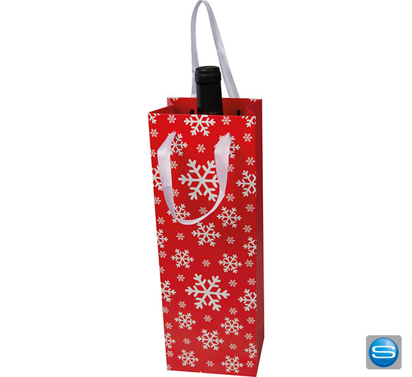 Die individuell bedruckbare Weihnachtstragetasche ist aus Papier mit Schneeflockenmotiv und 2 Tragehenkeln. Die Werbetüte ist geeignet für eine Wein-, Sekt- oder Champagnerflasche. Die Werbung wird digital auf ein Etikett gedruckt und an geeigneter Stelle angebracht.
