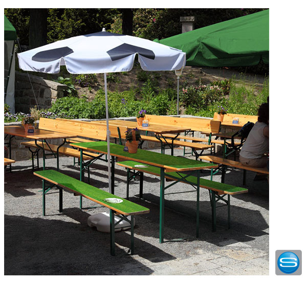 Diese Bierzeltgarnituren sind bieten eine perfekte Lösung Ihre Werbung in Szene zu setzten. Ob beim Schützenfest, auf Partys und Hochzeiten, im Biergarten, bei Straßenfesten oder Grillabenden im Garten, sie sind jeder Veranstaltung gewachsen. Die hochwertige, robuste, wetterfeste, 3-teiligen Bierzeltgarniture bestehen aus einem Biertisch und zwei Bierbänken. Sie werden komplett montiert geliefert und sind somit sofort einsatzbereit. Zur platzsparenden Lagerung können sie einfach und schnell zusammengeklappt werden.