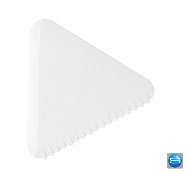 Individuell bedruckbarer Eiskratzer in dreieckiger Form mit glatter Kratzkante und Kratzzähne als Ihr persönliches Werbemittel oder Werbegeschenk. Seitenlängen: 13,4 cm x 11,9 cm