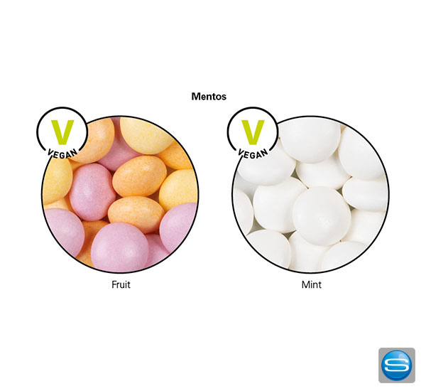 Füllung: 24 Mentos Kaudragees in der Geschmacksrichtung Mint oder Fruit, 65 g
