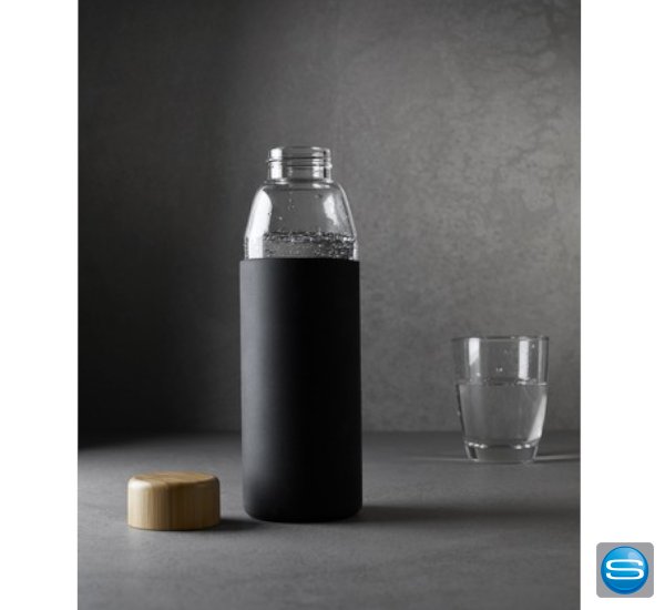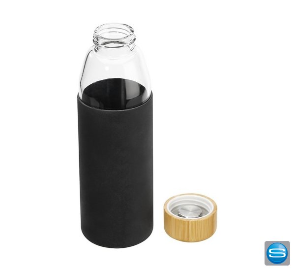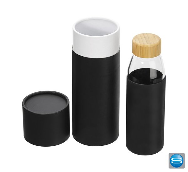 Hitzebeständige Glas-Trinkflasche mit einer Kapazität von 0,5 Litern. Die nachhaltige Flasche besitzt einen Bambusdeckel und eine Silikonmanschette. Verpackt ist die Glasflasche in einer Geschenkbox. Die Flasche aus Borosilikatglas kann selbstverständlich ganz nach Ihren Wünschen mit Ihrem Logo versehen werden und eignet sich daher ideal als Werbeartikel für Ihre Firma.