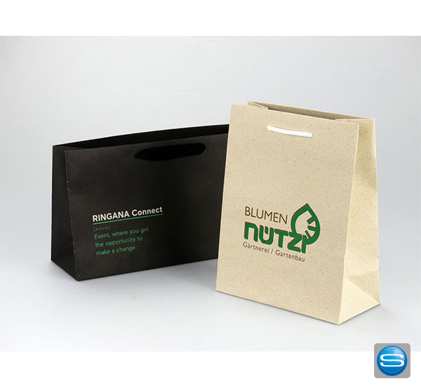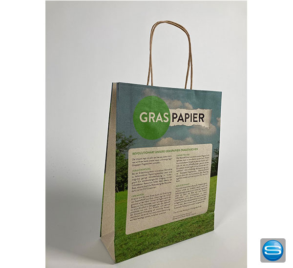 100%ig nachhaltige Papiertragetasche aus 30% Graspapier + 70% Recycling-Papier - die neueste Entwicklung für ökologische und nachhaltige Tragetaschen. Die Taschen werden in Europa produziert und sind in verschiedenen Qualitäten (Papierstärken) und Größen erhältlich. Die Taschen sind nicht gebleicht und haben einen natürlichen beige-Ton mit leichter Grasstruktur. Die Henkel sind entweder aus Baumwoll-Kordeln oder gedrehten Papierkordeln. Sie können Ihre Tasche vollflächig, individuell gestalten. Der Druck erfolgt in 4-farbigem Offsetdruck.