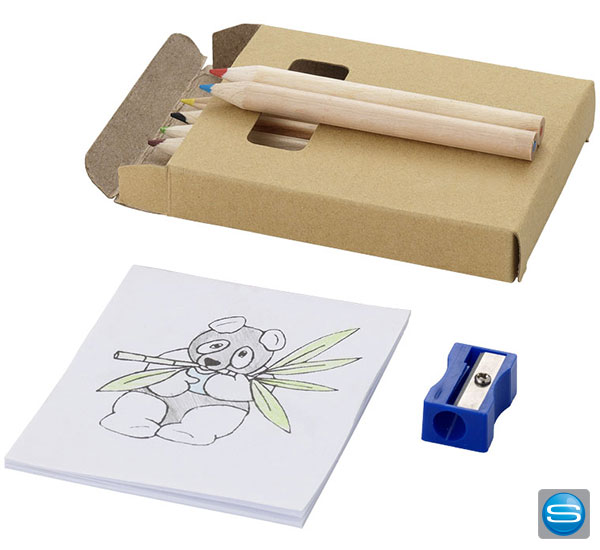 8-teiliges Set bestehend aus sechs Buntstiften, einem Spitzer und einem Block zum Ausmalen. Die Verpackung des Sets kann individuell mit Ihrem Logo bedruckt oder mit einem Sticker beklebt werden. Das ideale Werbegeschenk für Ihre kleinsten Kunden!