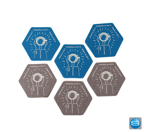 Untersetzer aus natürlichem Wollfilz oder aus recycelten PET-Flaschen in hexagonaler Form. Individuell mit Ihrem Logo oder Motiv bedruckbar. In diversen Farben erhältlich.