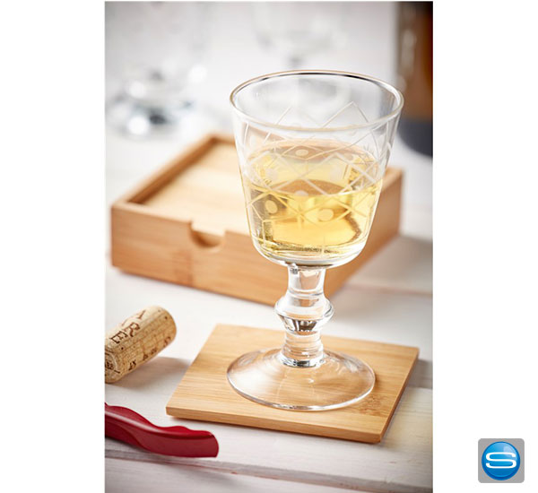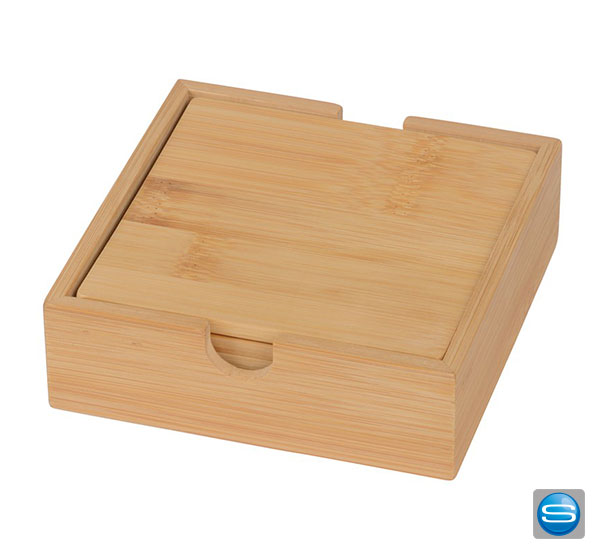 Das Set besteht aus vier gleich großen Untersetzern, die in einer praktischen Bambus-Box verpackt sind. Die Untersetzer eignen sich hervorragend für Kaffee oder Tee. Die Box lässt sich mit Ihrem Logo oder Motiv gravieren.