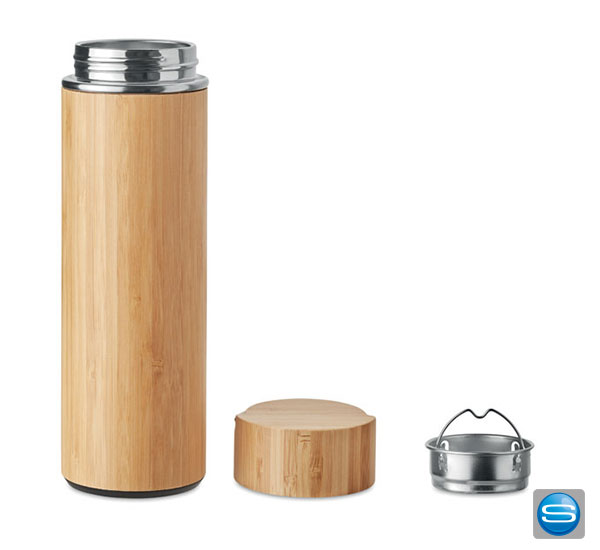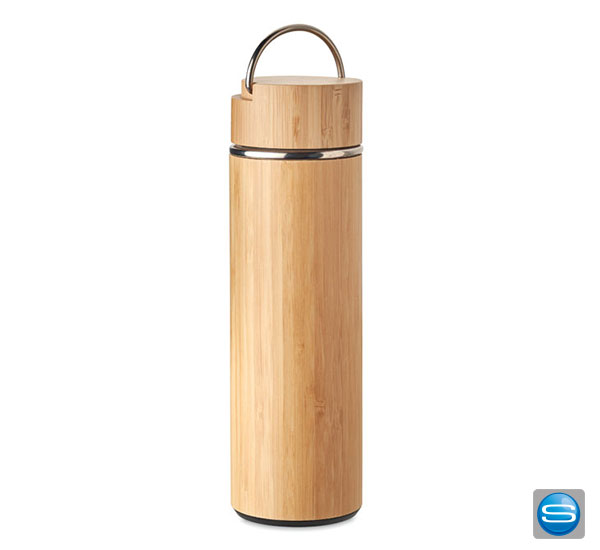 Die Doppelwandige Isolierflasche aus Edelstahl hat ein Bambus-Finish. Für frischen Tee ist der Tee-Sieb im Inneren der Flasche ideal geeignet. Die Thermoskanne hat ein Fassungsvermögen von 480 ml und ist Auslaufsicher. Da Bambus ein natürliches Material ist, können Farbton und Maße pro Artikel variieren. Dies kann zu Abweichungen im Ergebnis der Veredlung führen. Gerne bedrucken wir die Isolierflasche mit Ihrem Logo.