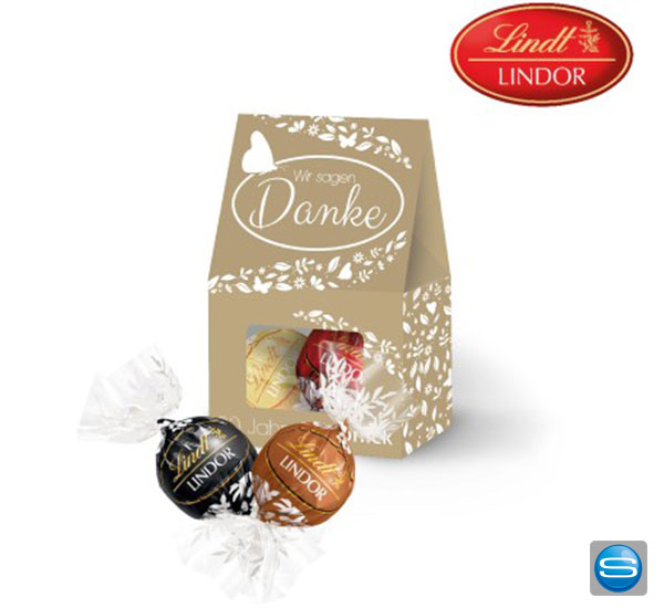 Überraschen Sie Ihre Kunden mit dem hochwertigen Lindor Schokolade Duo Pack in dekorativer Verpackung. Nach Wunsch bedrucken wir die Kartonage der Schokoladen Pralinés ganz individuell für Sie mit Ihrem Logo. Ein leckeres Giveaway! Inhalt 2 edle Lindt Lindor Pralinés ca. 24g in verschiedenen Geschmacksrichtungen
