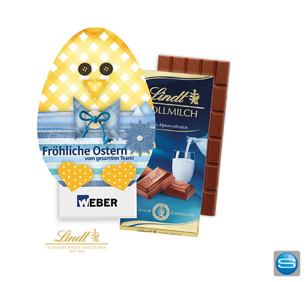 Verschenken Sie doch mal nicht die klassischen Werbeartikel zu Ostern sondern diese Tafel Lindt Schokolade mit dem süßen Hasen- oder Ostereimotiv auf der individuell bedruckbaren Präsentverpackung. Überraschen Sie Ihre Mitarbeiter und Kunden mit diesen schokoladigen Ostergrüßen und präsentieren Sie diese Lindt Schokoladentafel mit Ihrer persönlichen Werbung. Inhalt ca. 100g