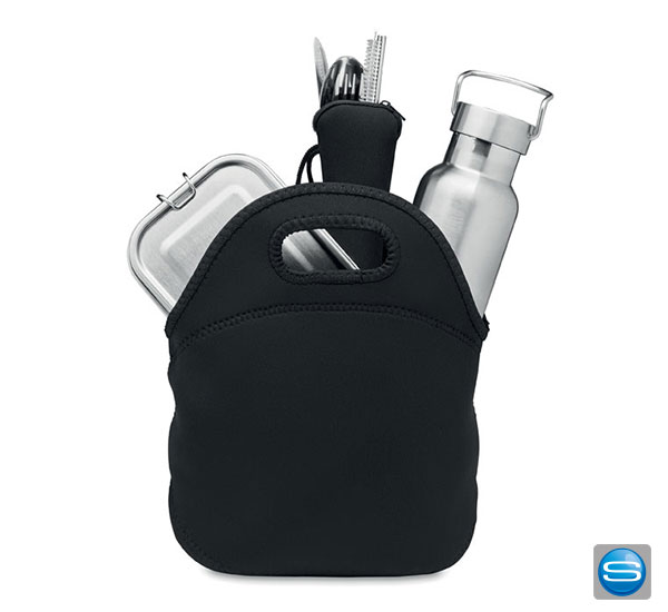 Das bedruckbare Lunch-Set enthält eine doppelwandige Isolierflasche aus Edelstahl (500 ml), Lunchbox (600 ml) und Besteck-Set. Verstaut in einer Neoprentasche mit Reißverschluss. Ihr Logo wird mittels Siebdruck, Transfer Siebdruck, Digitalertransferdruck, Laser, Tampondruck, Digitaldruck 360°, Laser 360° oder Rundum-Siebdruck (maximale Druckfläche 140mm x 227mm) angebracht.