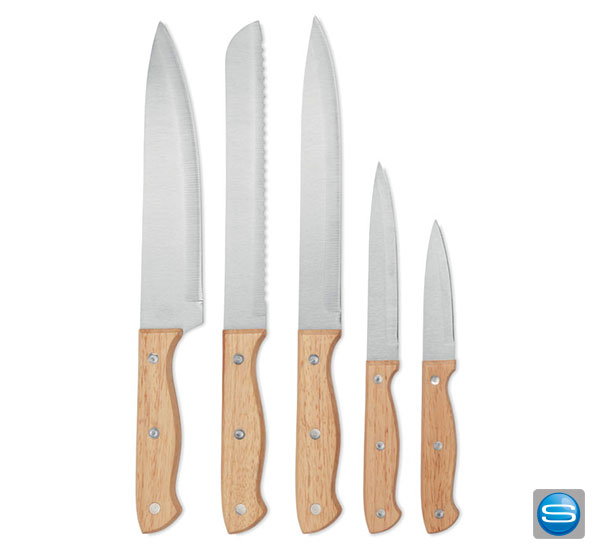 Messerblock aus Holz mit 5 unterschiedlichen Messern mit Ihren Logo gravieren. Besteht aus einem Kochmesser, Brotmesser, Tranchiermesser, Universalmesser und Schälmesser. Eine originale Idee für ein Werbegeschenk für Ihre Kunden und Mitarbeiter. Die Messerklingen sind aus Edelstahl gefertigt und haben einen Griff aus Holz. Da Holz ein natürliches Material ist, können Farbton und Maße pro Artikel variieren. Dies kann zu Abweichungen im Ergebnis der Veredlung führen.