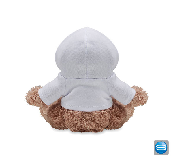 Der Hund ist aus Plüsch mit individuell bedruckbarem Kapuzenpulli, in der Farbe weiß. Ideal für Sublimationsdruck. Ihr Firmenlogo wird mittels Transfer Siebdruck, Digitalertransferdruck oder Sublimationstransfer angebracht.