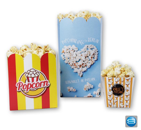 Die Popcornbecher werden flach geliefert und lassen sich ganz einfach zu einer stabilen Box aufrichten. Die Boxen gibt es in drei verschiedenen Größen.