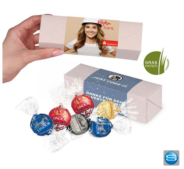 Mit diesem exklusiven Werbeartikel treffen Sie bei Ihren Kunden immer ins Schwarze - Lindor Präsent mit den unvergleichlich feinen Pralinen.Lindor Pralinen mit LogoDie süße Verführung ist verpackt in einer Geschenkbox, die Sie nach Ihren Wünschen individuell bedrucken können. Ein idealer Werbeartikel um Ihren Kunden sowie Mitarbeitern eine Freude zu bereiten und gleichzeitig Ihre Marke perfekt zu präsentieren.Produkteigenschaften
