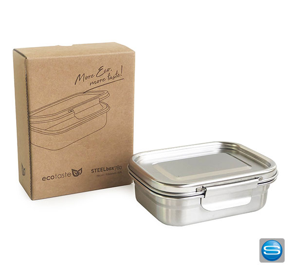 Praktische, auslaufsichere Lunchbox aus Edelstahl. Die Box ist mit einem Dichtungsring aus Silikon ausgestattet und hat ein komfortables Klicksystem zum Verschließen. Zum Reinigen im Geschirrspüler geeignet. Erhältlich in 2 Größen. Einzeln verpackt ein hochwertiges und nachhaltiges Geschenk für Ihre Kunden.