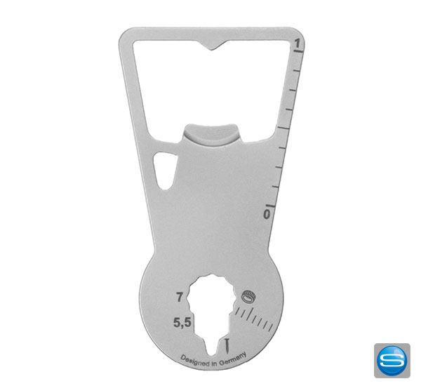 Funktionen: 1. Flaschenöffner, 2. Einkaufswagenlöser, 3. Zentimetermaß, 4. Inchmaß, 5. Vielzahnschlüssel, 6. Sechskantschlüssel, 7. Nagelzieher, 8. Ringöse