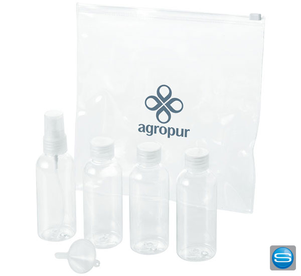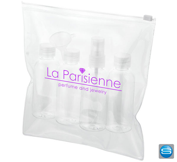 Wiederverschließbarer Zipperbeutel (TSA zugelassen) mit 3 wiederbefüllbaren 80ml-Flaschen, 1 wiederbefüllbare Sprühflasche mit 80ml und ein Mini-Trichter zum einfachen Befüllen der Fläschchen. Beutel und Flaschen werden getrennt geliefert. Ihr Logo oder Motiv kann auf den Beutel gedruckt werden (ein Druck auf die Flaschen ist nicht möglich).