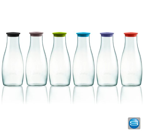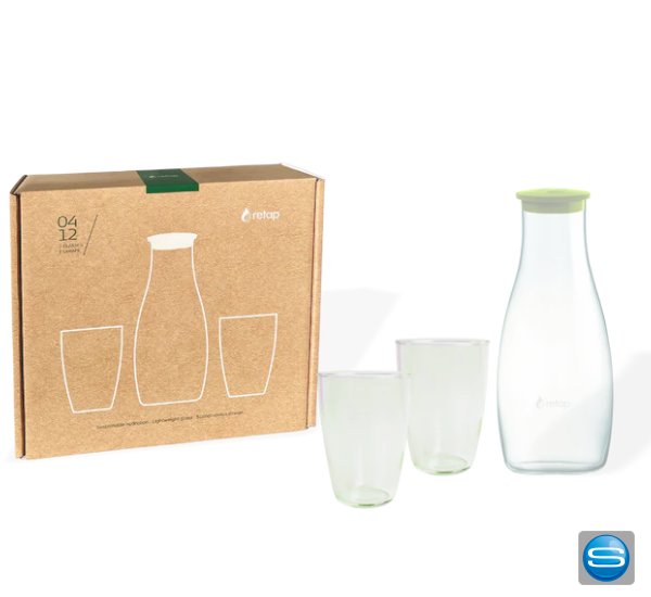 Die 1,2l Wasserkaraffe des dänischen Unternehmens Retap gibt es auch im Set mit zwei schönen 0,4l Gläsern. Die Karaffe wird mit einem bunten Deckel (wählbar aus den 6 Standardfarben) geliefert. Das Set eignet sich ideal als hochwertiges Werbegeschenk für Mitarbeiter, Kunden oder Geschäftspartner.