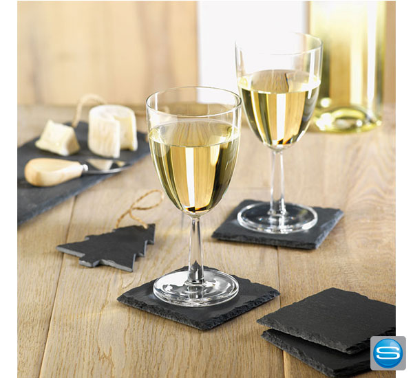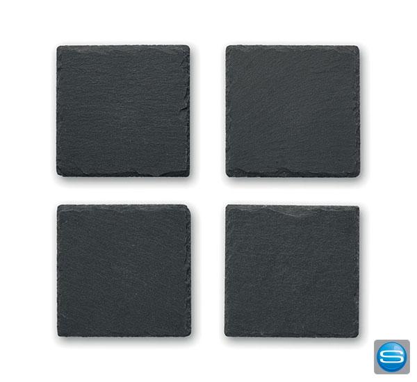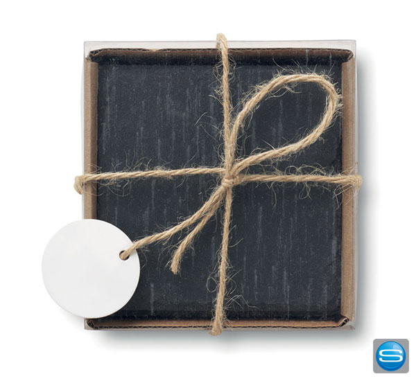 Langlebige Untersetzer aus robusten Schiefer mit EVA-Füßchen. 4er-Set mit 4 gleichgroßen Untersetzern im Format 10x10cm. Die schwarzen Untersetzer können individuell 1-farbig mit Ihrem Logo bedruckt oder farblos graviert werden. Sie haben die Möglichkeit alle 4 Untersetzer oder auch nur 1, 2 oder 3 individualisieren zu lassen. Das 4er Set wird in einer schönen Geschenkverpackung geliefert. Glasuntersetzer mit eigenem Logo sind ein elegantes und gern genutztes Werbegeschenk.