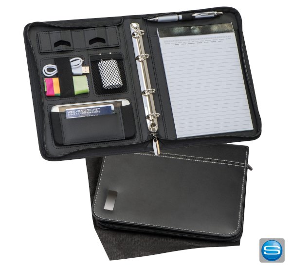 Praktische Ringbuchmappe mit Reißverschluss, Karten-, Reißverschluss- und Steckfächer, Stiftschlaufen, inkl. Block. Durch Logoprägung wird diese Konferenzmappe zu einem tollen Werbegeschenk für Ihre Kunden.