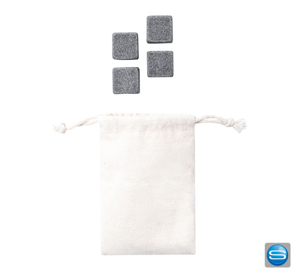 Die vier bedruckbaren Steineiswürfel im Baumwollbeutel, sind wiederverwendbar. Ihr Firmenzeichen wird mittels Transferdruck oder Digital-Transferdruck an dem Werbeträger angebracht.