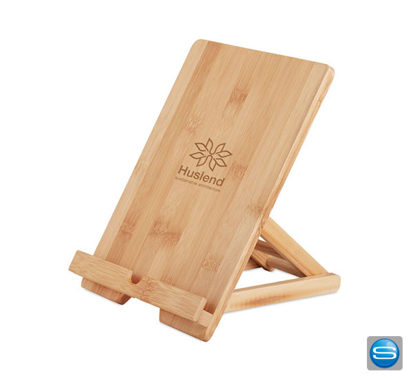 Der gravierbare unhd zugleich faltbare Tablet- oder Smartphone Halter besteht aus Bambus. Sie können ihn für Videoanrufe, Live-Streams, Filme, Serie und Andere verwenden. Durch die Aussparung an der Unterseite des Halters können Lade- oder Kopfhörerkabel durchgeführt werden. Ihre gewünschte Werbung wird auf die Halterung, mittels Laser, eingraviert. Da Bambus ein natürliches Material ist, können Farbton und Maße pro Artikel variieren. Dies kann zu Abweichungen im Ergebnis der Veredlung führen.