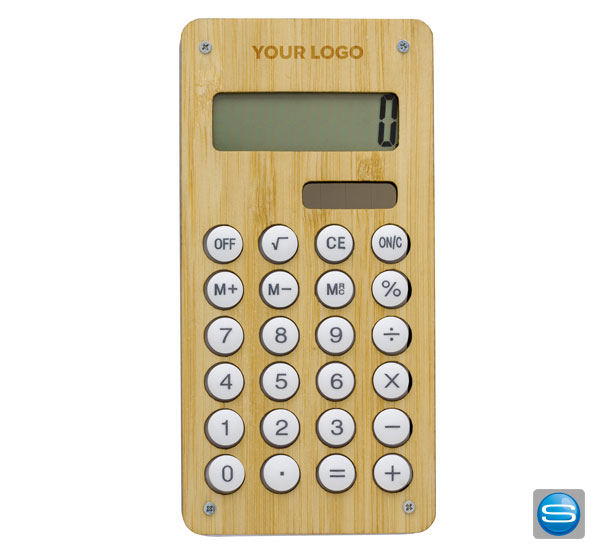 Dieser Solar-Bambus-Taschenrechner reflektiert den ECO-Gedanken den viele auch beim Einsatz von Werbemitteln wünschen. Er ist mit einem 8-stelligem Display ausgestattet. Ihre Werbeanbringung kann unterhalb der Tasten im Format von max. 25x10 mm angebracht werden.
