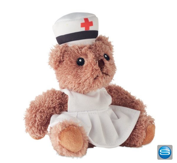 Dieser liebevoll gestaltete Teddybär aus weichem Polyester ist als Krankenschwester gekleidet, inklusive Kleid und Haube. Augen, Nase und Mund sind aufgestickt, was ihm einen besonders freundlichen und hochwertigen Ausdruck verleiht. Ideal als Geschenk oder dekoratives Accessoire.Teddybär als Werbegeschenk