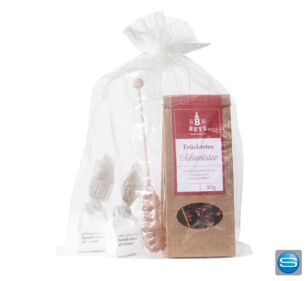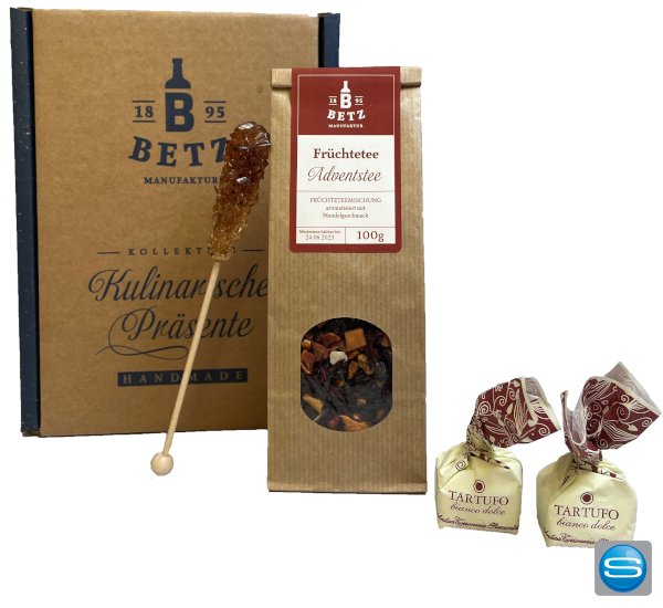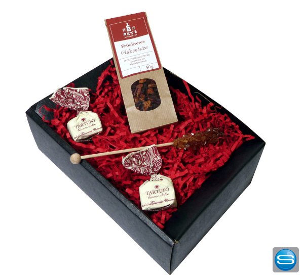 Das Set „Abendruhe“ beinhaltet eine 50g Tüte Früchtetee Adventstee, einen Kandisstick zum Süßen und Rühren und zwei Tartufi dolci zum Naschen. Verpackt ist das Set in einer schönen Präsentkartonage mit Füllmaterial oder in einem Oraganzabeutel. Ihr Logo kann auf dem Etikett des Tees angebracht werden, was die Box zu einem tollen Werbeartikel für Ihre Firma macht.