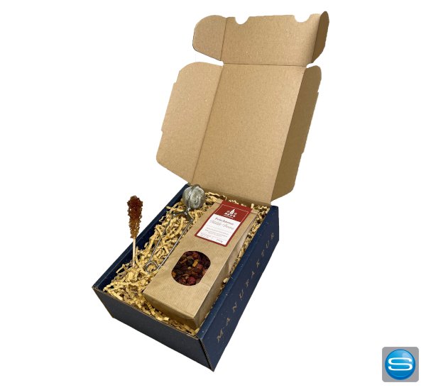 Das Tee-Set Wellness besteht aus einer 50g Tüte Früchtetee „Milde Beere“, einem Kandisstick zum Süßen und Rühren und einer Tee-Siebzange. Das Set ist in einer schönen Präsentkartonage mit Füllmaterial verpackt. Das Etikett auf der Teepackung kann ganz nach Ihren Wünschen mit Ihrem Logo versehen werden, was die Box zu einem perfekten Werbepräsent macht.