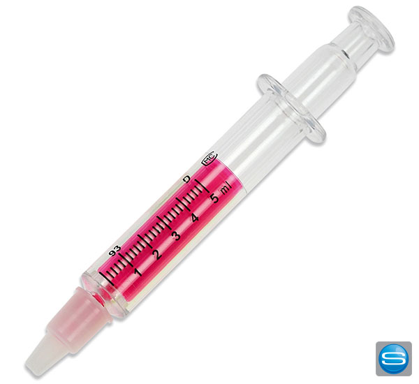 Witziger Leuchtmarker in 4 verschiedenen Farben in Spritzenform. Ein idealer Werbeartikel für z.B. Pharmaindustire, Pflegedienste, Krankenhäuser oder Arztpraxen. Der Spritzenstift kann in bis zu 4 Farben auf der gegenüberliegenden Seite der Messskala bedruckt werden.