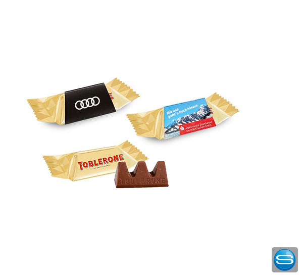 Die TOBLERONE Minis ca. 8g in Originalverpackung mit individuell bedruckter Werbebanderole. Verdedeln Sie diesen kleinen Snack für Zwischendurch mit Ihrer eigens gestalteten Werbung und versüßen Sie so Ihren Kunden, Mitarbeitern und Geschäftspartner den Tag. Es gibt noch Fragen? Dann einfach bei uns melden! Gegen Aufpreis Optional: Werbekartonage aus Graspapier, Naturkarton oder Coffee-Cup-Paper. Haltbarkeit: 6 Monate.