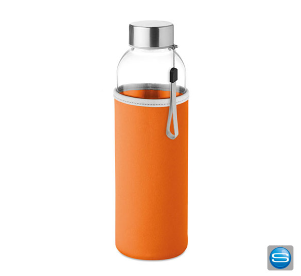 Glastrinkflasche mit Neopren-Schutzhülle als Werbemittel mit Logo bedrucken