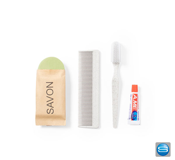 Unverzichtbares Pflegeset mit Zahnbürste, Zahnpasta, Kamm und Seife. Inhalt: Zahnbürste und Kamm aus Weizenstroh, wodurch die Verwendung natürlicher Rohstoffe gefördert und Schadstoffemissionen reduziert werden. Zahnpasta in der 6 g Tube mit Schraubverschluss. 20 g Seifenstück. Das Set wird in einer individuellen Design-Kraftbox präsentiert. Ihr Firmenzeichen wird mittels Tampondruck angebracht.