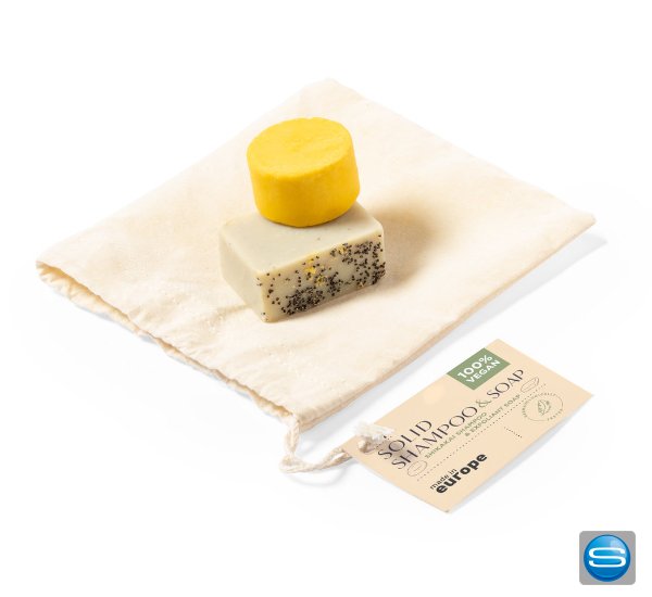 Vegane Seife und Shampoo als Set im bedruckbarem Beutel mit Ihrem Motiv