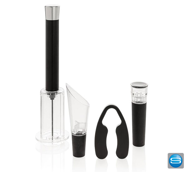 4-teiliges Vino Connoisseur Set für echte Weinkenner. Das Weinset kann individuell mit Ihrem Firmenlogo bedruckt oder graviert werden und eignet sich daher perfekt als Werbegeschenk. Das bedruckbare Set besteht aus einem Öffner, einem Flaschenschneider, einem Stopfen mit Vakuumpumpe und einem Ausgießer mit Belüfter. Verpackt ist das gravierbare Weinkenner-Set in einer schönen Geschenkbox.