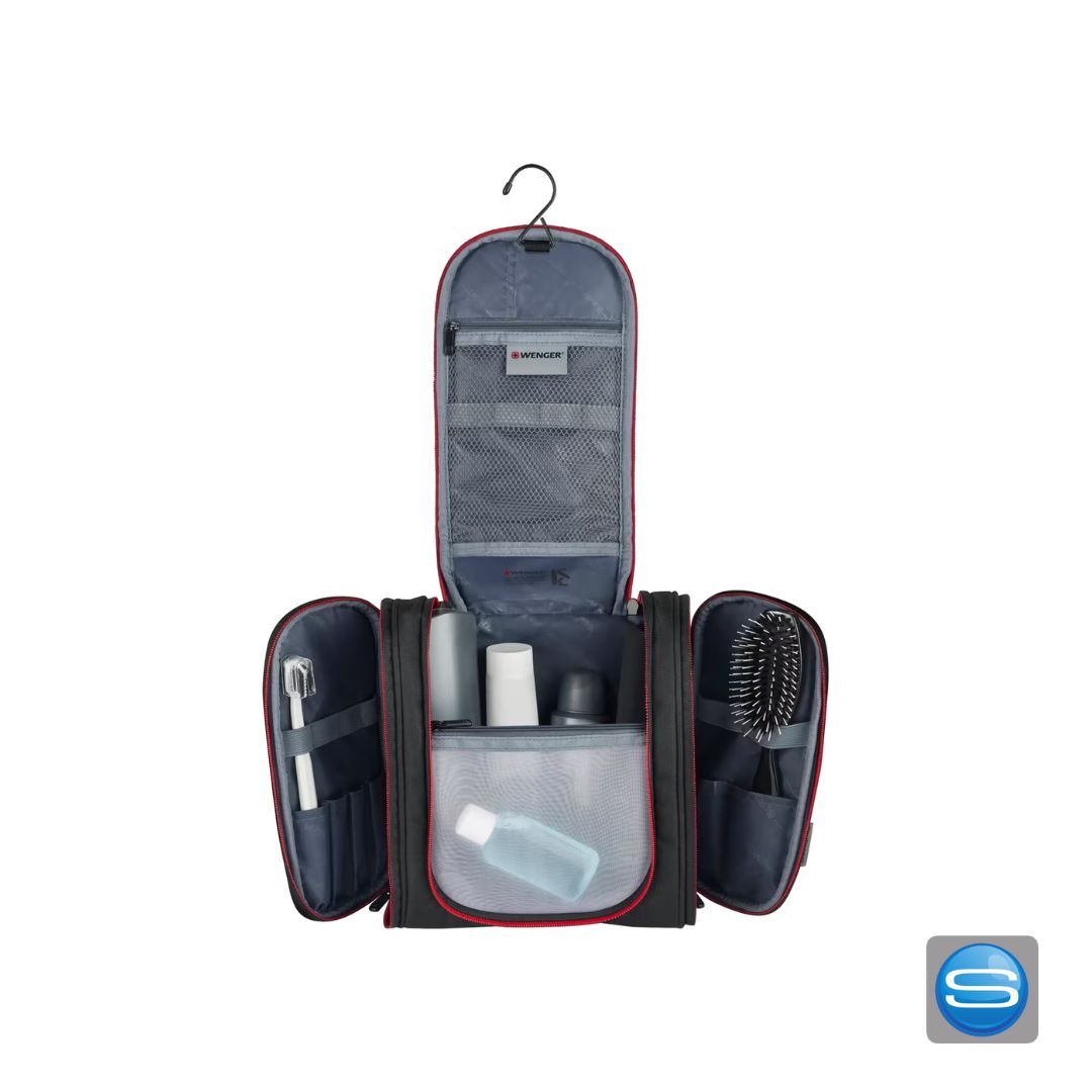 Die Kosmetiktasche der Marke Wenger ist der ideale Reisebegleiter. Die Tasche zum Aufhängen verfügt über elastische Schlaufen für das Duschgel oder die Bodylotion, sowie über eine gefütterte Reißverschlusstasche. Die Kosmetiktasche ist wasserabweisend und hat ein antibakterielles Futter.