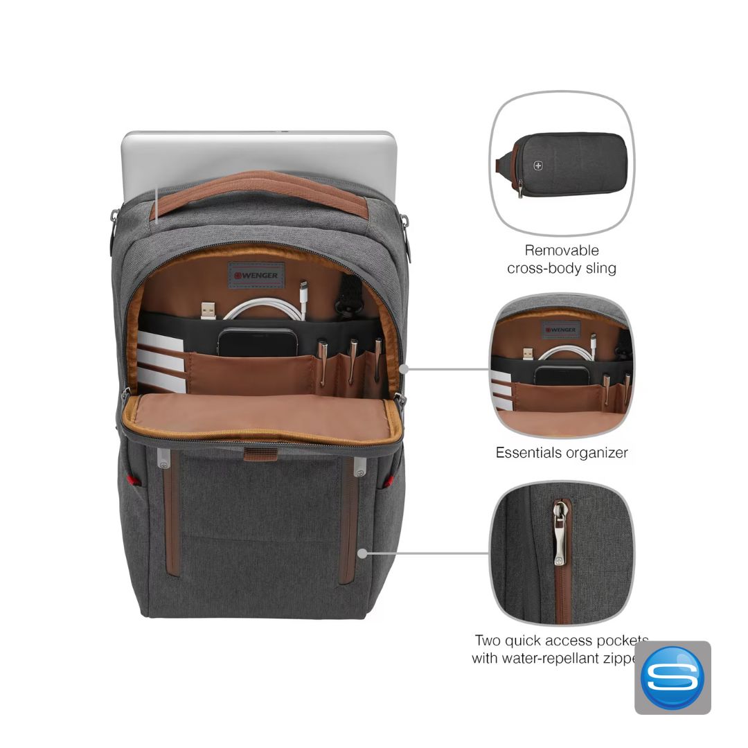 Der Laptoprucksack CityUpgrade der Marke Wenger ist der perfekte Begleiter. Der Rucksack hat wasserfeste Schnellzugriffsfächer, Seitenfächer, gepolsterte Laptop- und Tablet-Fächer, eine kleine Umhängetasche für Tagesausflüge, einen Trolleyriemen, einen Organizer für Accessoires, gepolsterte Schulterriemen und einen Griff zum einfachen Tragen.