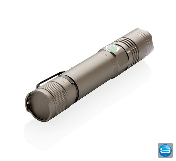 Diese aufladbare Taschenlampe aus Aluminium erzeugt mit ihren 3W 130 Lumen und leuchtet bis zu 200m weit. Sie verfügt über 3 Lichtmodi: 50% hell oder blinkend. Dank eines IPX4 Standards ist auch schlechtes Wetter kein Problem! Der eingebaute Akku bringt eine Leistung von 2.200 mAh und bietet eine Leuchtdauer von bis zu 8h. Die Lieferung erfolgt inklusive Mikro-USB Kabel zum Wiederaufladen (ohne Powerbank). Ihr Logo kann individuell auf die Taschenlampe gedruckt oder graviert werden. Gegen Aufpreis ist auch ein individuell bedruckter Schuber für die Einzelverpackung möglich.