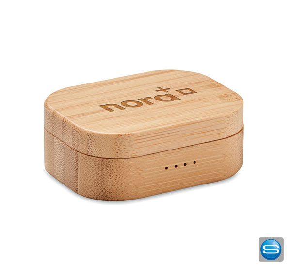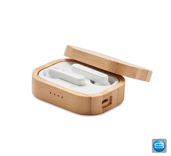TWS 5.0 wireless Stereo Ohrhörer-Set mit eingebautem 30 mAh Akku. Spielzeit ca. 3 h. Inkl. Mikro-USB-Ladekabel. Lieferung mit 185-mAh Ladebox im Bambusgehäuse mit Magnetverschluss. Ihr Logo wird mittels Digital Label, Doming, Laser oder Tampondruck angebracht.