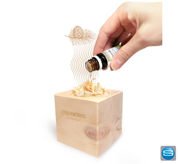 ZirbenWürfel Set mit einem 75 mm ZirbenWürfel. Der Würfel hat eine Einfräsung für ZirbenFlocken und das Ölfläschchen. Ein kleines Säckchen ZirbenFlocken und 10ml ZirbenÖl werden mitgeliefert. Verpackt ist der Zirbenwürfel in einem hochwertigen Geschenkkarton mit Sicherheitslaschen für das Öl. Der Würfel kann beispielsweise am Nachttisch im Schlafzimmer oder im Wohnzimmer platziert werden. Der aromtische Duft der Zirbe verbreitet sich in kürzester Zeit im Raum. Das Öl kann in der dafür vorgesehenen Öffnung des Würfels verstaut werden. Selbstverständlich kann der Würfel individuell mit Ihrem Logo graviert werden, was den Würfel zu einem perfekten Werbeartikel für Ihr Unternehmen macht.