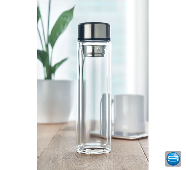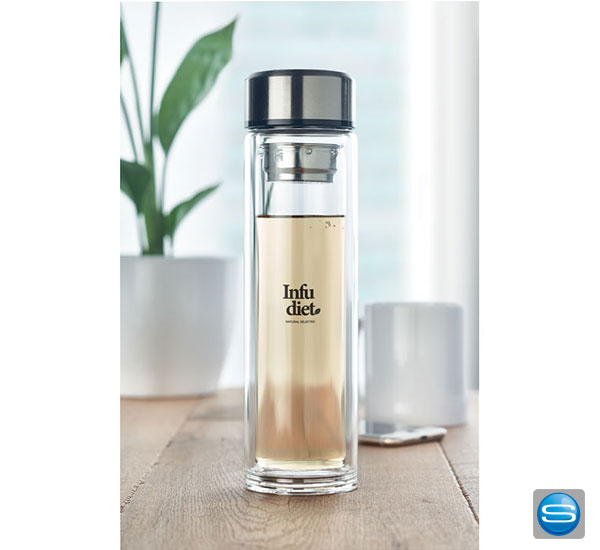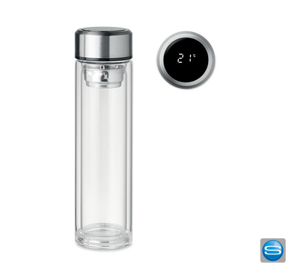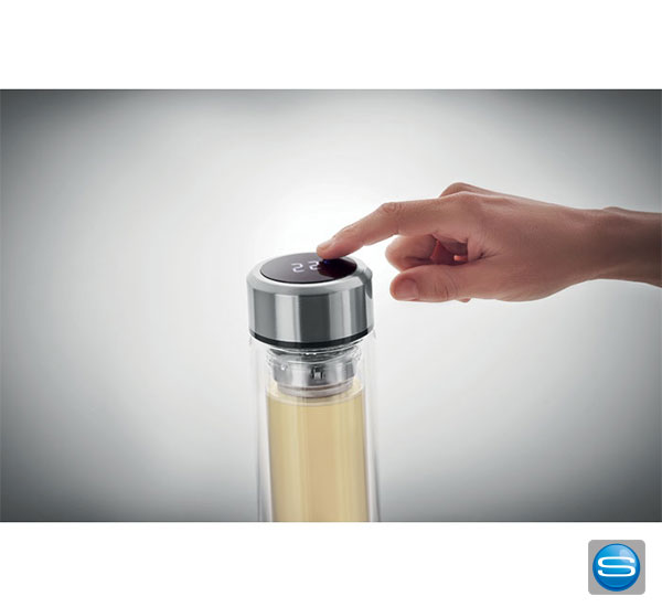 In diese bedruckbare doppelwandige Flasche aus Borosilikat-Glas können sowohl heiße als auch kalte Getränke gefüllt werden. Im Gegensatz zu normalem Glas wird es bei extremen Temperaturschwankungen nicht reißen. Im Inneren befindet sich ein herausnehmbares Tee-Ei/Sieb für Tee oder aber um Ihr Wasser mit Ihrer Lieblingsfrucht zu aromatisieren. Auf der Oberseite des Deckels ist ein eingebautes LED-Touch-Thermometer, das die aktuelle Temperatur der Flüssigkeit im Inneren anzeigt. Mit dieser Flasche verbrennen Sie sich nie wieder an heißen Getränken. Sie ist auslaufsicher, sodass sie problemlos in Ihrer Tasche transportiert werden kann. Inklusive 1 CR 2450 Batterie. Fassungsvermögen: 390ml. Eine Lasergravur ist auf Borosilikatglas nicht möglich.